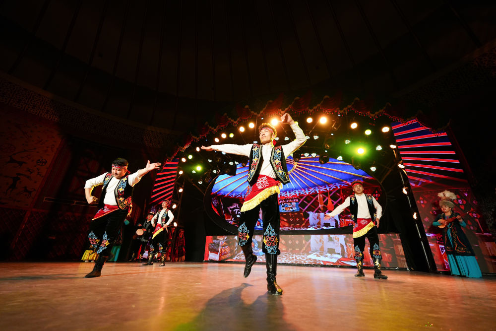 2025年5月1日,《新疆维吾尔自治区玛纳斯非物质文化遗产保护条例》正式实施,为保护这部列入联合国教科文组织非遗名录的柯尔克孜族英雄史诗提供了法规遵循。这是2025年4月22日,演员在位于新疆阿图什市的玛纳斯史诗大剧院为游客表演。