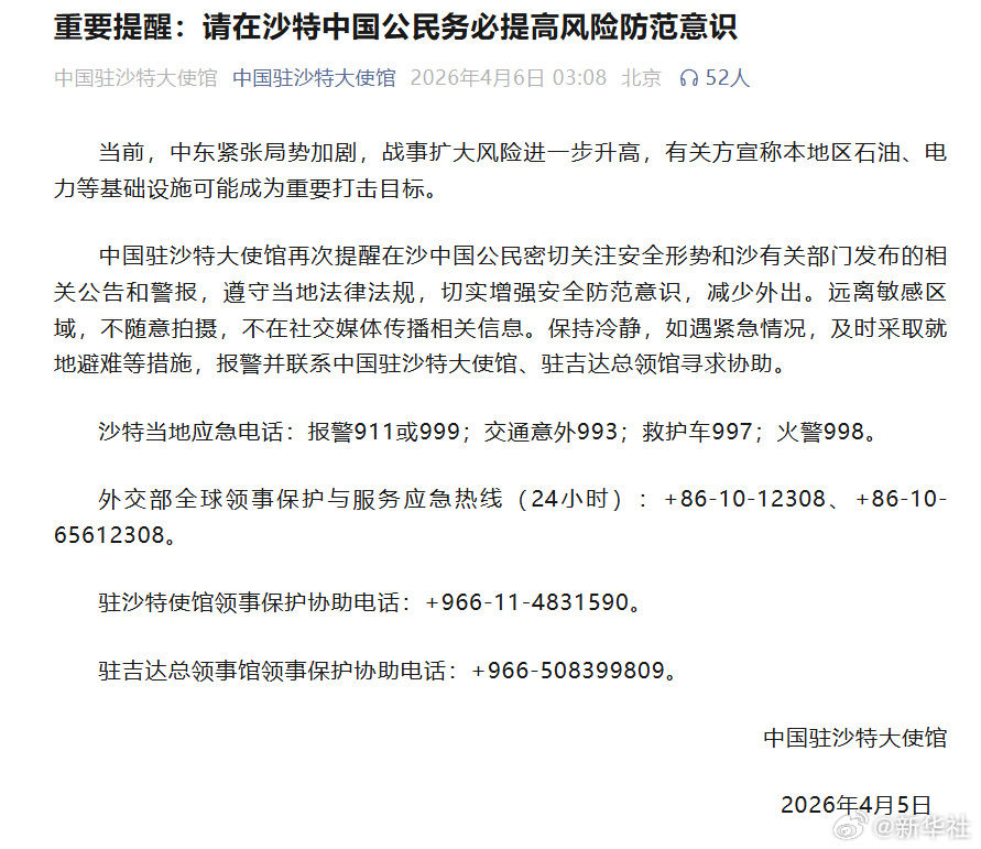 中国驻沙特大使馆再次提醒在沙中国公民密切关注安全形势和沙有关部门发布的相关公告和警报,遵守当地法律法规,切实增强安全防范意识,减少外出。远离敏感区域,不随意拍摄,不在社交媒体传播相关信息。保持冷静,如遇紧急情况,及时采取就地避难等措施,报警并联系中国驻沙特大使馆、驻吉达总领馆寻求协助。