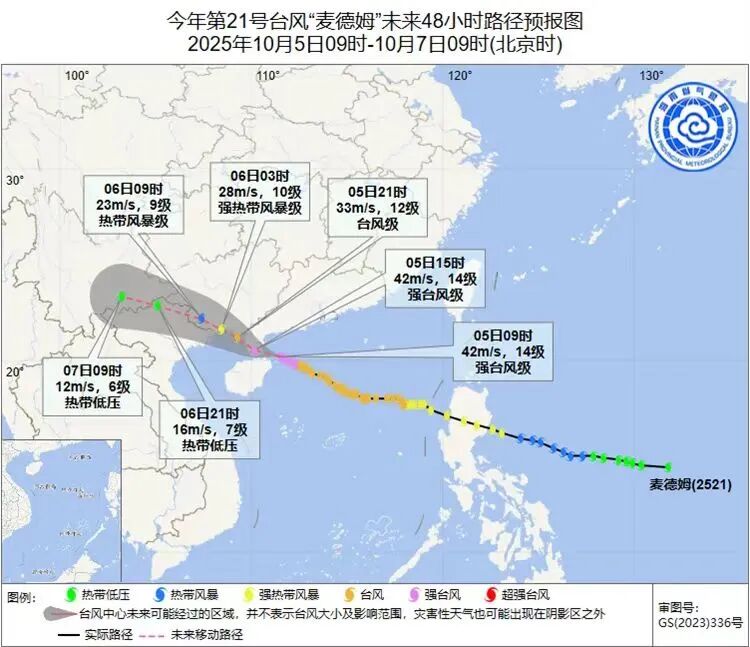 受其影响,10月5日,南海北部的大部分海域风力11~13级、阵风14~15级,其中“麦德姆”中心经过的附近海面旋转风可达13~15级、阵风15~17级;海南岛北半部地区有强风雨天气,海口、文昌、定安、澄迈、临高和儋州等市县200~300毫米、局地400毫米。文昌、海口、澄迈、定安和临高陆地阵风12~14级,琼海、万宁、东方、昌江和儋州陆地阵风9~11级,请相关市县加强人员安全管理,继续做好防范工作。