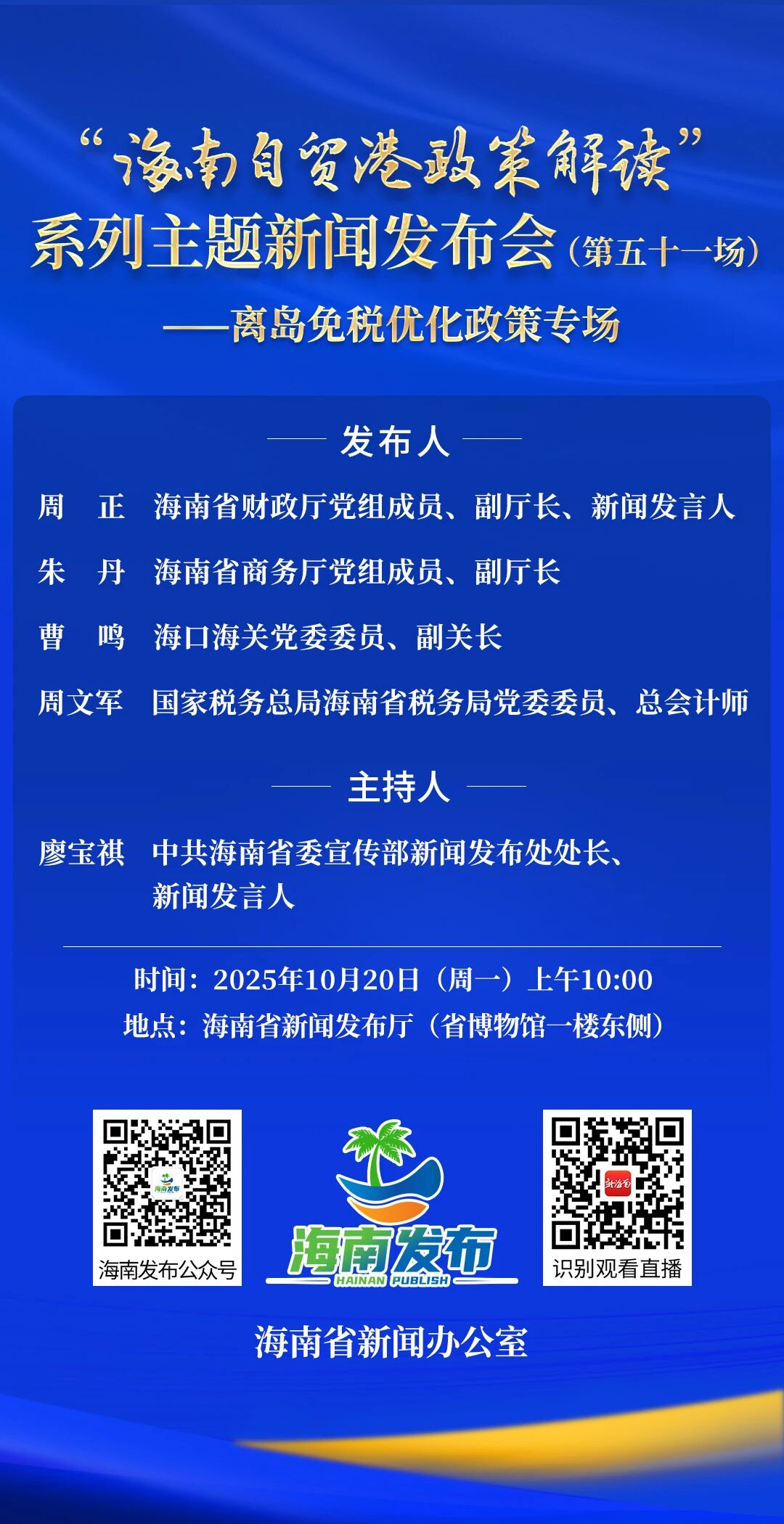 海南省新闻办公室将于2025年10月20日(星期一)上午10:00在海南省新闻发布厅(省博物馆一楼东侧)举行“海南自贸港政策解读”系列主题新闻发布会(第五十一场)——离岛免税优化政策专场,邀请海南省财政厅党组成员、副厅长、新闻发言人周正,海南省商务厅党组成员、副厅长朱丹,海口海关党委委员、副关长曹鸣,国家税务总局海南省税务局党委委员、总会计师周文军介绍相关情况,并答记者问。