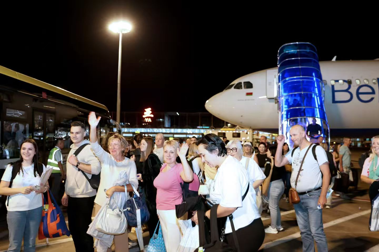 10月8日晚,乘坐“三亚⇌明斯克”航线首航飞机的境外旅客抵达三亚。