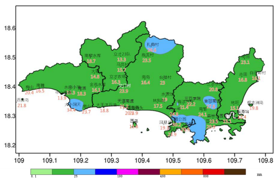 南海热带低压30日08时加强为今年第14号台风“蓝湖”(热带风暴级),08时其中心位于北纬17.8度、东经107.9度,即在越南广治省洞海市偏东方向约145公里海面上(图1),中心附近最大风力8级(18米/秒)。预计,“蓝湖”将以每小时25~30公里的速度向西偏北方向移动,强度变化不大,将于今天下午在越南中部沿海登陆,登陆后逐渐减弱。