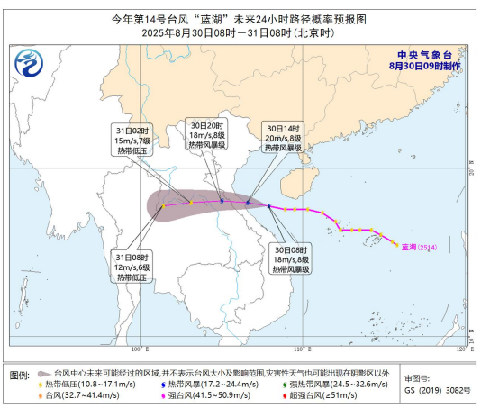 30日上午到中午,本市东部和南部海面,风力6~7级,阵风8~10级;30日下午起上述海区风力逐渐减弱到5~7级、雷雨时阵风8~9级。8月30日,西沙、中沙和南沙群岛附近海面风力5~7级、雷雨时阵风8~9级。31日起上述海区风力逐渐减弱。