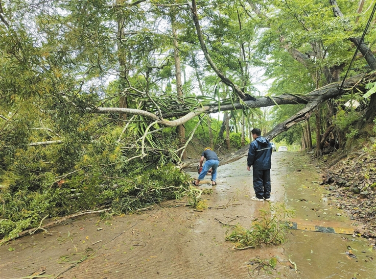 此时,在恒力集团三亚建设项目附近道路,风雨交加、情况危急。朝阳社区工作人员不顾雨水打湿衣衫,认真清理着被狂风吹落的断枝树叶,全力保障道路通畅。社区网格员黎莹莹笑着说:“道路通了,大家出行就安全些,这点辛苦不算什么。”