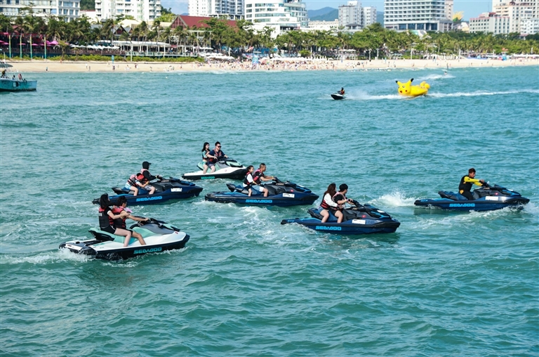 在大东海旅游区水上项目中心海面上,游客体验摩托艇项目。三亚传媒融媒体记者 陈聪聪 摄