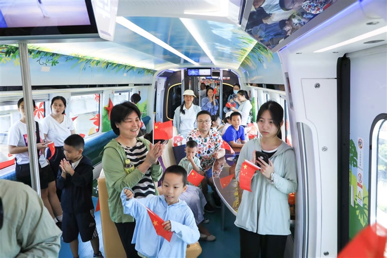 同时,列车以“中国红”为主色调,悬挂国旗、灯笼等装饰,营造热烈节日氛围。车厢拉杆处设置“主题留言书签”,收集旅客的祝福和对自贸港建设的期待。乘务员佩戴国庆主题饰物,分发手持国旗和爱国贴纸,让列车成为传递家国情怀的移动展台。