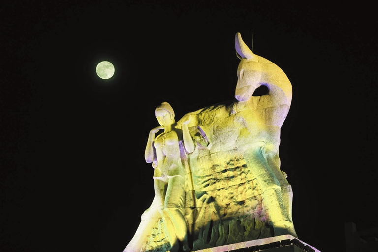 图为明月在鹿回头雕像后升起(二次曝光)。 记者 李学仕 摄影报道