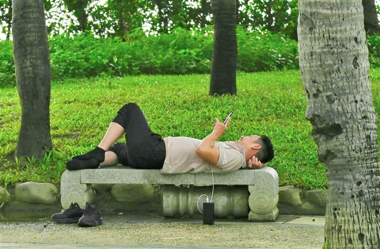 近日,在三亚湾,一游客躺卧在公共座椅上,将本可服务多人的公共设施变成了个人的“睡床”。