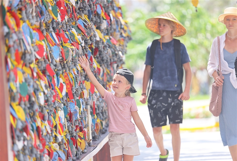 10月7日,外国游客带着孩子在三亚南山文化旅游区游览。