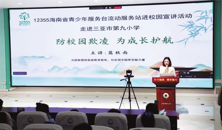 与此同时,市第九小学友谊校区邀请高级家庭教育指导师、国家三级心理咨询师莫秋南到校做“防校园欺凌 为成长护航”专题讲座。莫老师以小游戏开场,与参加活动的学生、家长和班主任分享经验和心得。莫老师表示,家长要关注孩子的情绪变化,学会宽容和接纳;学校方面也要及时关注孩子的行为变化,多肯定欣赏学生,定时组织宣传教育活动;孩子若遇到自身难以解决的问题,除了及时与家长和学校老师反映外,也可以找12355海南省青少年服务台寻求热线支持。