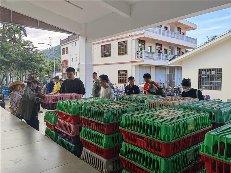 近日,吉阳区罗蓬村委会中村小组农贸市场里十分热闹:一筐筐毛茸茸、活蹦乱跳的小鸡苗清脆地叫着,村民们有序登记,领取这份来自驻村工作队的“特殊礼物”。