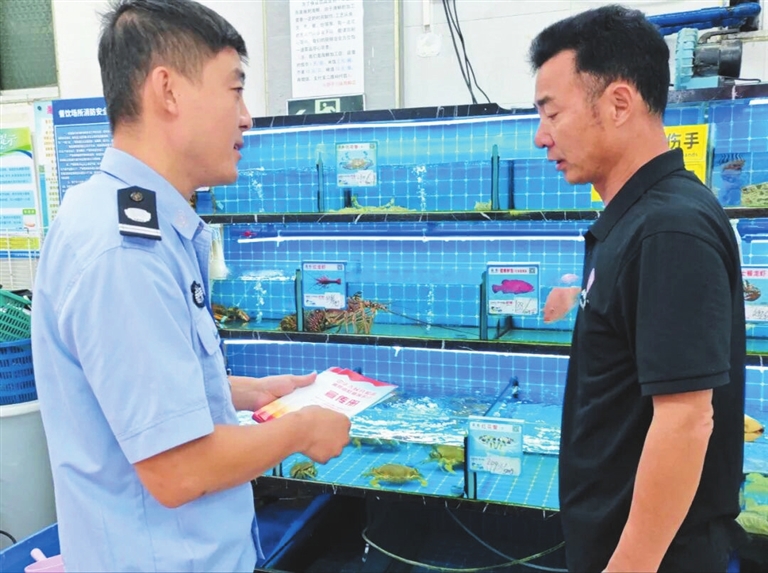 工作人员向海鲜经营者普及相关法律法规。黄世烽 摄