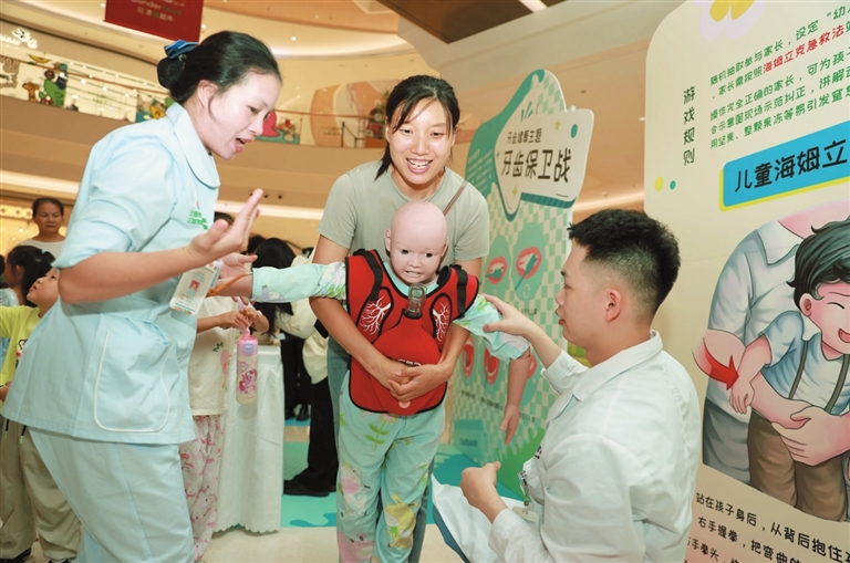 10月17日晚,三亚天悦城商场一楼,市民在医护人员指导下操作“海姆立克急救法”。当晚,“筑牢安全防线 护佑儿童健康”2025年健康海南主题宣传活动(三亚站)在此举行,活动由海南省卫生健康委员会主办,海南省优生优育公共服务中心、海南省健康宣传教育中心和三亚市卫生健康委员会联合承办。
