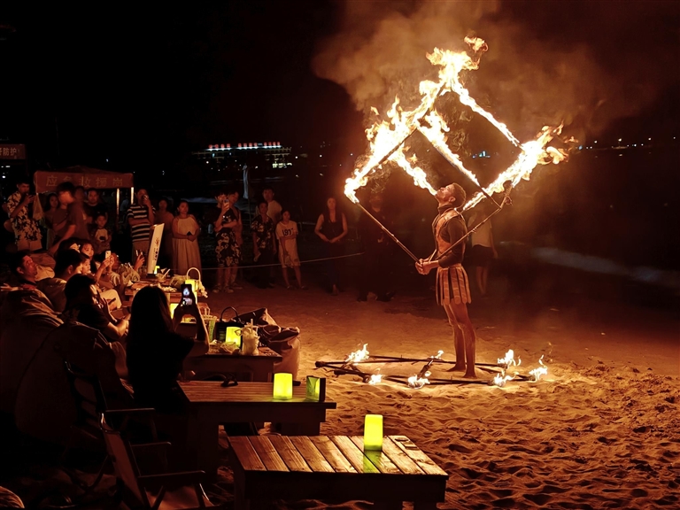 10月19日晚,三亚大东海旅游区海风轻拂,涛声阵阵,吸引了众多夜游的游客。人们或驻足观赏精彩的花火表演,沉浸于悠扬的歌声中;或沿着沙滩悠然漫步,随性而至便轻声哼唱。动静相宜的休闲方式,让游人在舒适晚风中,尽享秋夜海岛的浪漫与惬意。