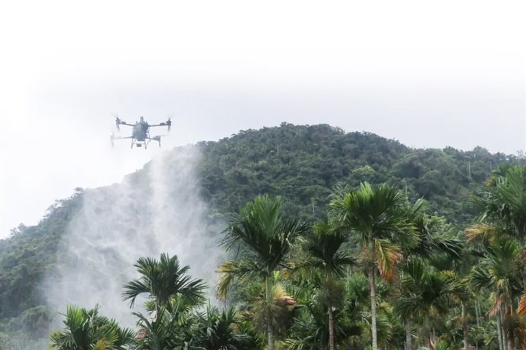 面对丘陵山地地形和人工喷药难度大的问题,无人机飞防展现出了显著优势。海南骐境园林工程有限公司负责人介绍说:“无人机飞防在效率、精准度、安全性和地形适应性方面都全面超越了人工喷防。传统人工防治使用机动背负式喷雾器,不仅效率低下,还存在‘跑冒滴漏’现象,成本浪费大。”而一台大疆3WWDZ-U70A无人机单次可承载药水70升,日均作业面积达260至300亩,效率是传统人工方式的百倍以上。更重要的是,通过精准的航线规划和变量喷洒技术,药液能够均匀喷洒在叶面上,用水量仅为传统方式的1/60,农药利用率提高30%至40%,真正实现了节水节药、绿色环保的目标。