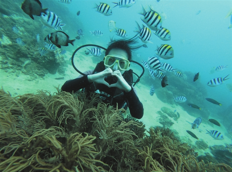 游客在蜈支洲岛海域惬意体验潜水项目。