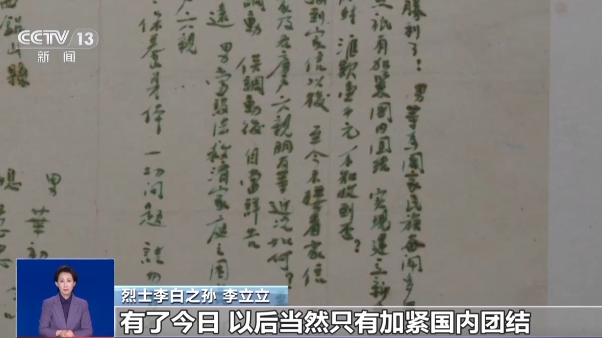 烈士李白之孙 李立立:我爷爷曾经跟我奶奶讲,我们这项工作,是党的眼睛、党的耳朵,我们收发的每一份报都关系到党的事业。记得在抗战即将胜利的时候,他写给他父亲一封信当中表达了这种奋斗的目标即将实现的期待,他是这样讲的:“父亲大人日本已投降,我们胜利了,男等为国家民族奋斗多年,总算亲眼看到有了今日,以后当然只有加紧国内团结,实现建立新中国。”